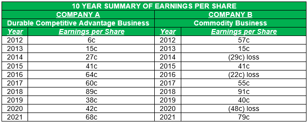 As you can see above, Company A with a durable competitive advantage has more predictable earnings than Company B.